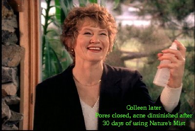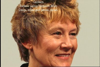 Moisture and oil. Overproduction of oil in the skin (oily skin) may result from dry skin, insufficient daily moisture, heredity, age, skin color, hormones, stress, weather (wind, cold, sun), perspiration, improper diet and too many toxins in your body. Excessive oil can be a problem up to age 40. After that, too little oil, a factor in aging lines, becomes the more common condition. Darker-skinned people tend to have more oil and not enough water in their skin while lighter-skinned individuals tend to have more water and not enough oil. Whatever the cause, the most important consideration in maintaining the proper moisture/oil balance, is to provide the skin with adequate external moisture. To be benefit the skin's moisture/oil balance, acid mantle and overall functioning, a moisturizer applied to the skin must be a water that is mild, natural, pH correct and applied as a fine mist. For this, there is only NATURE'S MIST®. When the skin's water and oil are out of balance, the result is usually excess oil because oil displaces water. When there is too much oil or too little water, the skin's pores and sebaceous glands can become oil-clogged and saturated with dirt and toxins. This leads to bacterial infection, especially when the dryness has also disrupted the skin's natural pH balance, which protects against bacteria. Improper cleansing can greatly aggravate the situation (See "Directions for Application"). The result is oily skin and the familiar acne blemish (although the same or similar circumstances can result in other dermatological problems). If you discover acne blemishes on your skin, you should always be concerned. Blemishes (pimples and zits) not only affect your appearance and self esteem, they signal that things are not running smoothly in your body. A trip to the doctor or a lifestyle change may be in order. ![]() Some NATURE'S MIST® acne testimonials. (References are on file and may be examined upon request.) A powerful NATURE'S MIST® testimonial comes from a woman in Oregon who suffered from severe teenage acne, then chronic adult acne. As a result, in her 40's, her facial pores were noticeably enlarged. After applying NATURE'S MIST® several times a day for two weeks, carefully following the Directions for Application, the enlarged pores were gone! "People couldn't believe it," she reports. "Everyone kept telling me I looked wonderful. They kept asking what my secret was. They wanted to know if I was using a new makeup or had a face lift or a chemical peel. My only secret was NATURE'S MIST®." Another endorsement comes from a woman college student who developed chronic blemishes as a result of athletics. Her parents spent thousands of dollars on Dermatologists and medication, which helped but didn't cure the condition. The condition went away, finally, when she began misting with NATURE'S MIST® prior to applying her medication. Directions for acne sufferers.